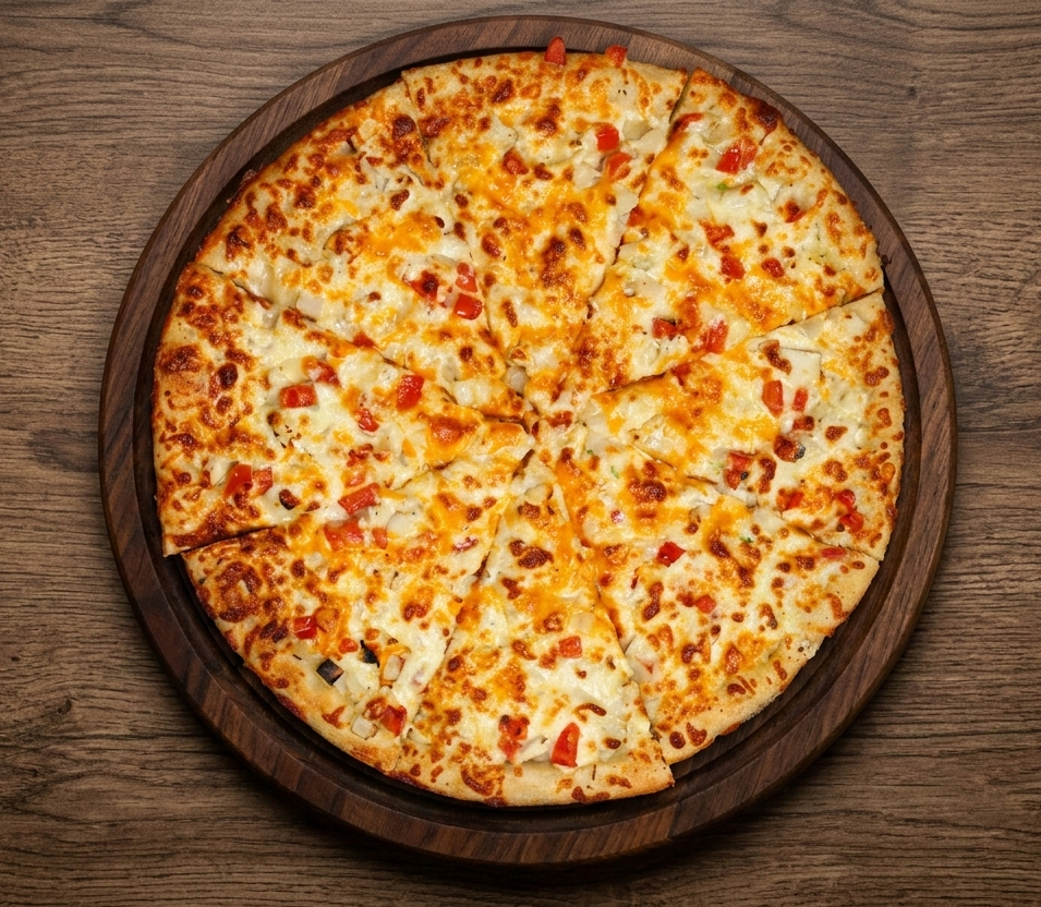 Alfredo sauce on base, Chicken, Tomatoes, Onion, Garlic, Cheddar Cheese and Mozzarella Cheese