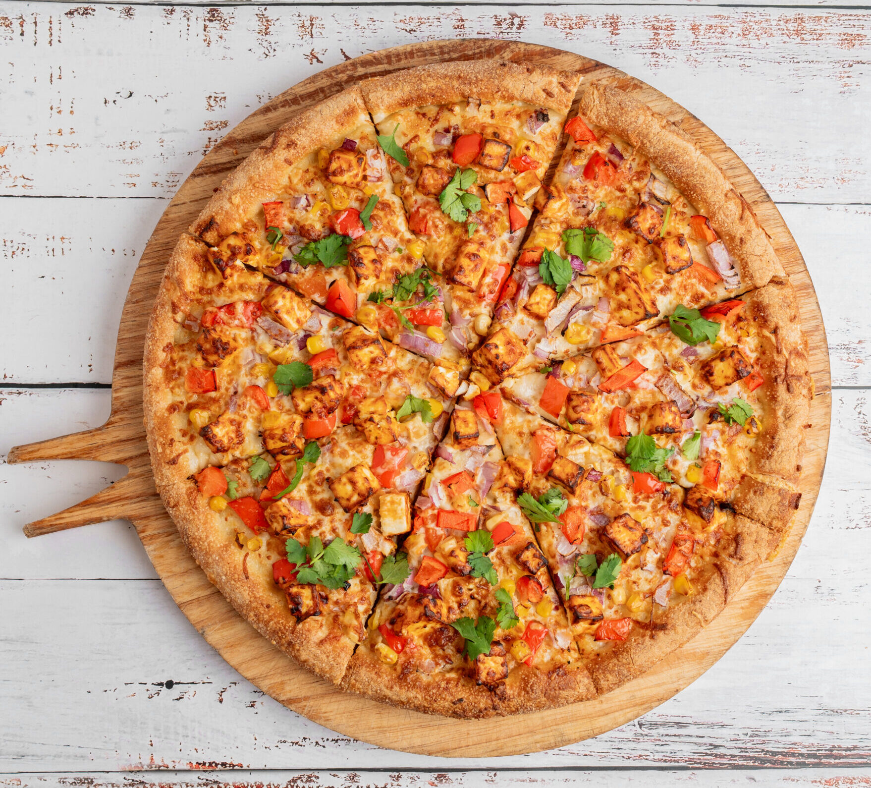 Garlic Base Sauce, Red Onion, Red Pepper, Corn, Mozzarella Cheese, Black Olives, Marinated Paneer, Ginger, Garlic, Cilantro, Drizzled With White Sauce On Top.