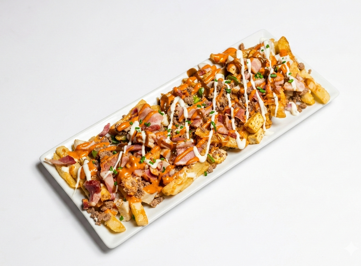 Delicious backed fries topped with chicken, lean ground beef, bacon and covered with melted mozzarella cheese served by drizzle of chipotle and ranch sauce .