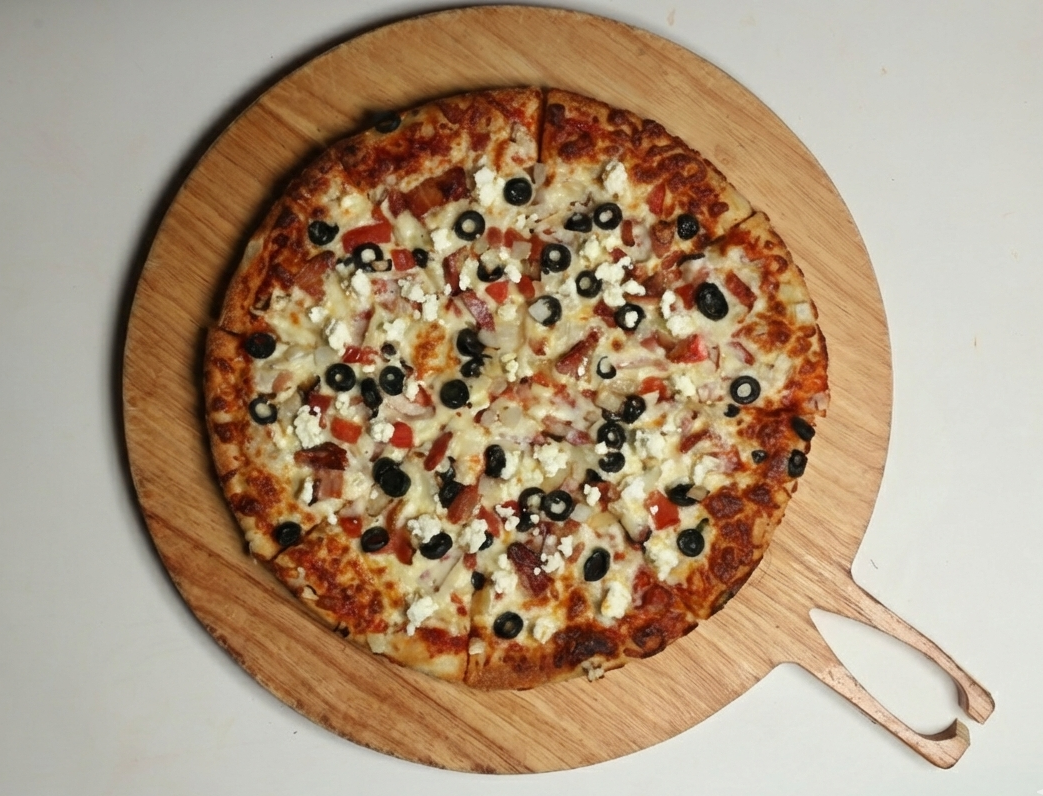 Onion, Artichoke hearts, Feta, Fresh tomatoes, Black olives and Mozzarella Cheese
