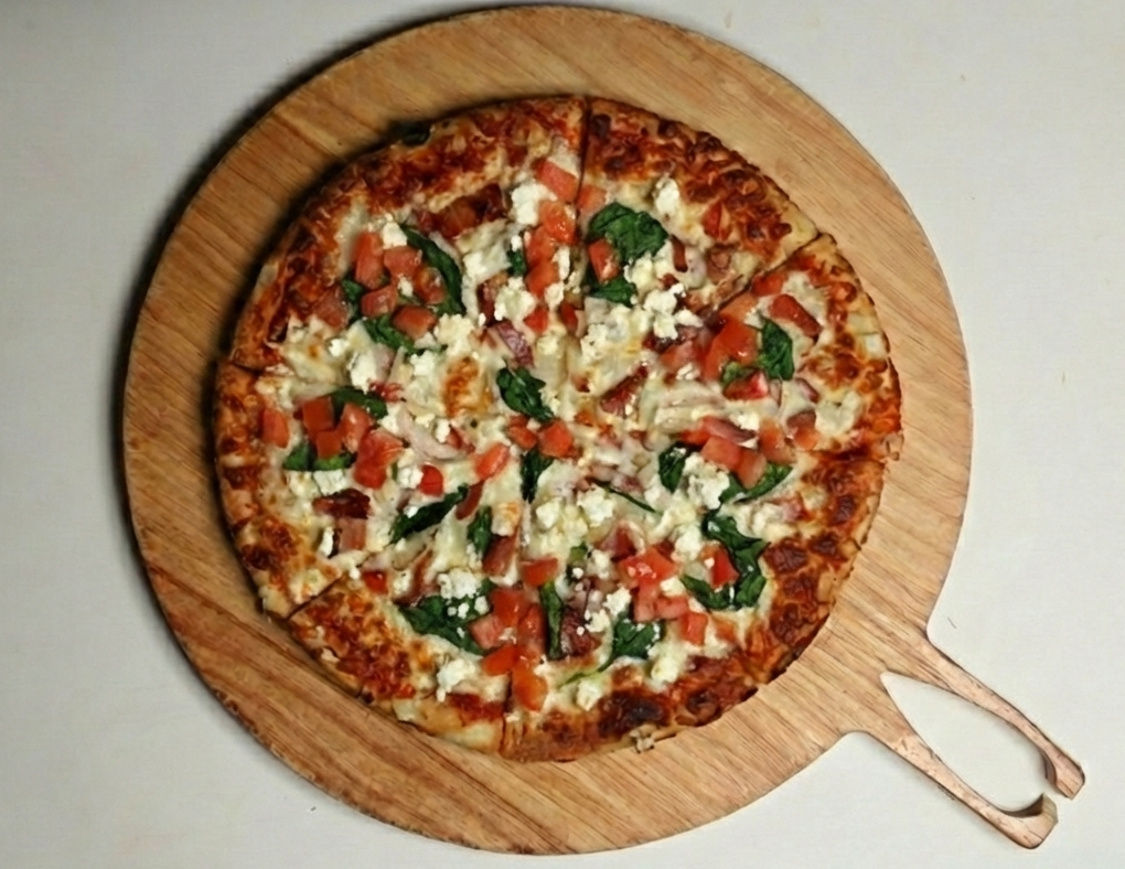 Onion, Spinach, Feta, Fresh tomatoes, Fresh Garlic and Mozzarella Cheese