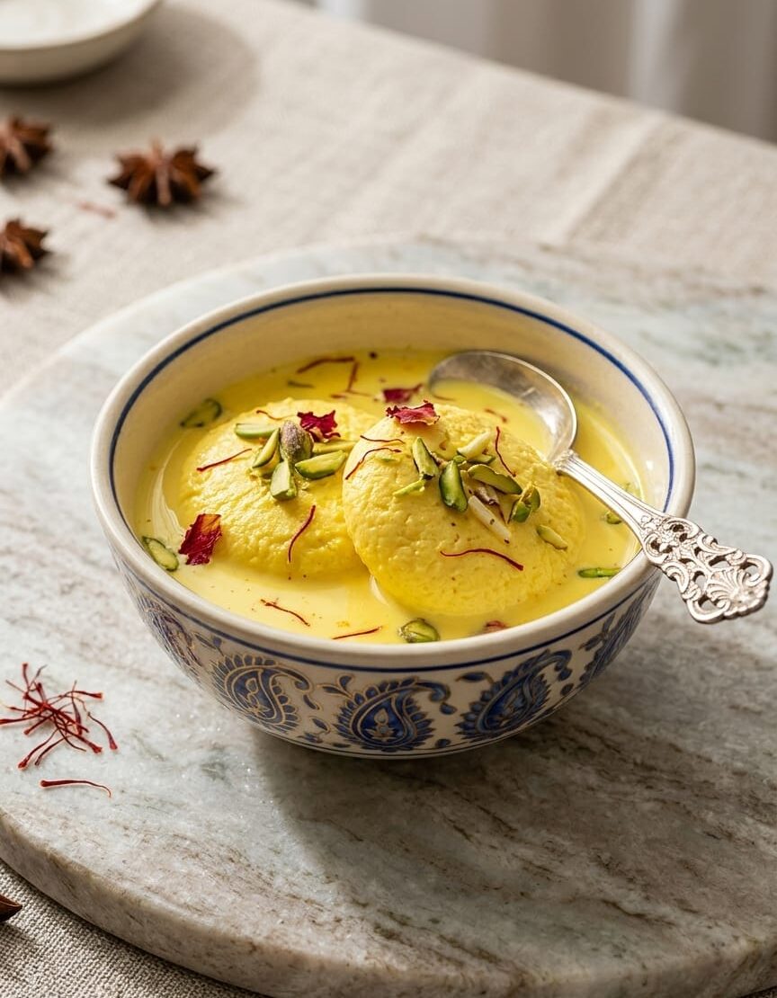 Rasmalai A beloved Indian dessert made with soft, spongy cheese dumplings soaked in rich, saffron-infused milk and topped with nuts.