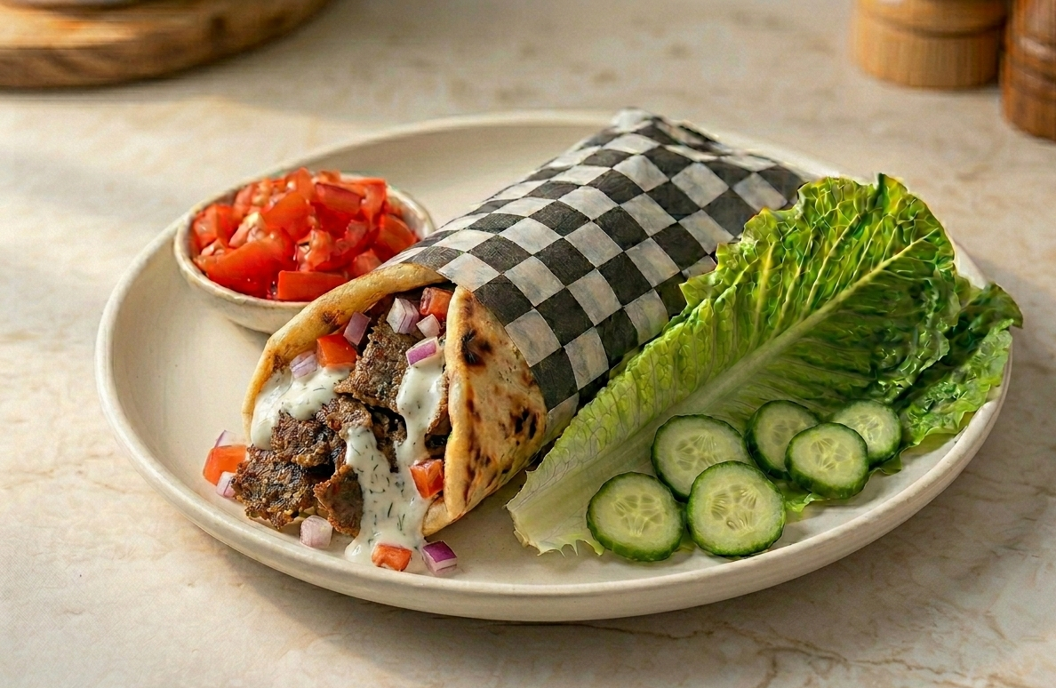 Savor our tzatziki Sauce Donair: succulent marinated meat, crisp veggies, including cucumber, tomato, romaine, onions, all crowned with our irresistible tzatziki sauce.